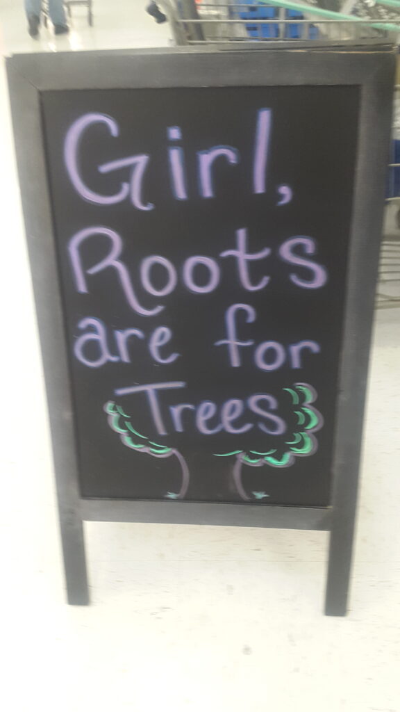 And then I see this sign outside of a beauty shop as if this is the only standard of beauty. Is it because it can be done easily with no effort with the exception of the beautician? And as long as you have a little money you too can be “beautiful?” Is it because we are programmed from a very young age of “acceptable” beauty standards?